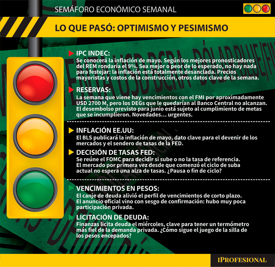 La semana próxima hay vencimientos con el Fondo por casi USD 2700 M. Al Central le quedarían en su activo menos de USD 1800 M en DEGs, la moneda con la cual se realizan operaciones con el Fondo. Según las condiciones actuales del programa, el FMI debería desembolsar en algún momento de junio el equivalente a casi USD 4000 M. Algunos trascendidos indican que recién lo haría en julio. Cuidado: los desembolsos son sujetos al cumplimiento de las metas (monetaria, fiscal y de reservas) del primer trimestre… que se incumplieron. Luz roja a modo de llamado de atención: es muy poco probable que el Fondo "le suelte la mano" al país ahora. Veremos cómo reacciona el mercado.