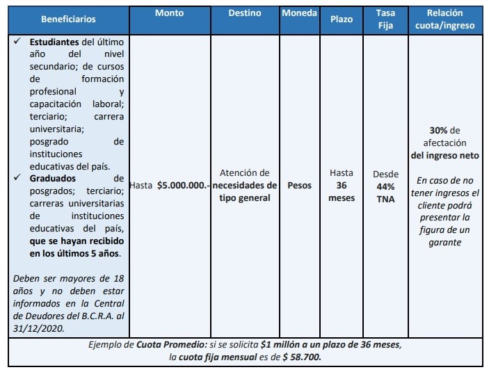Estos préstamos, por montos de hasta $5 millones, están disponibles desde hoy a través de la web del Banco Ciudad, y se brindan con una nueva tasa de interés fija y preferencial desde 44% TNA, a un plazo de hasta 36 meses. Se trata de una financiación que los estudiantes pueden utilizar para amplios destinos, y que admite la figura del garante para quienes no cuentan con ingresos propios.