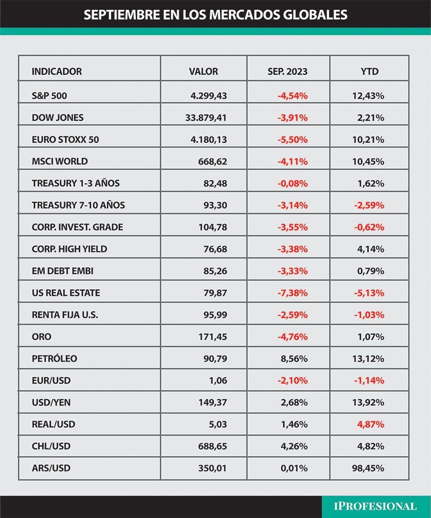 Septiembre fue un mes vertiginoso para los mercados globales, con un incremento notable en la tasa libre de riesgo que marcó el curso de los distintos tipos de activo. Una perspectiva de tasas de interés elevadas por más tiempo aguó en alguna medida el rally en acciones durante los meses previos.