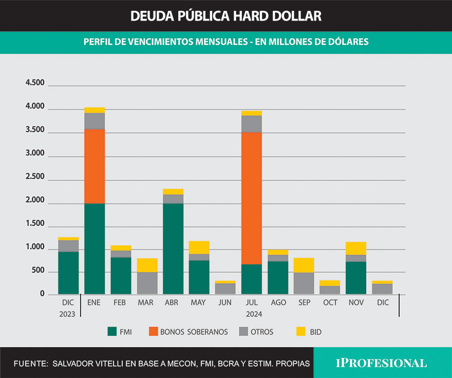 Aclarada la situación de Argentina con respecto a lo que queda de 2023 y el año 2024, sin dudas que los meses donde hay mayor necesidad de dólares para afrontar los vencimientos lucen ser enero y julio, justamente los meses donde hay pagos hacia los bonistas.