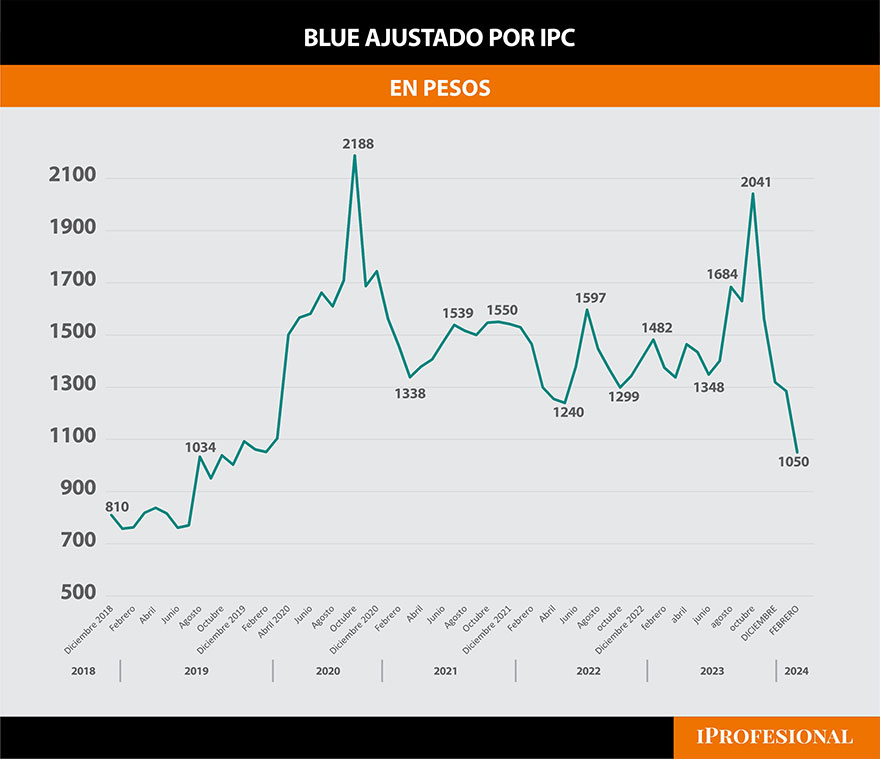Es más, si se toma en consideración los momentos de mayor presión sobre el tipo de cambio, las pérdidas son por demás significativas. De hecho, la más pronunciada es la que toma como referencia el precio de octubre de 2020, cuando a precios de hoy el blue costaba $2.190, es decir que valía exactamente el doble, lo cual implica una pérdida del 50%. Le sigue en orden de importancia el precio de octubre de 2023, que actualizado se ubicaría en los $2.040, por lo que la pérdida sería del 46%.
