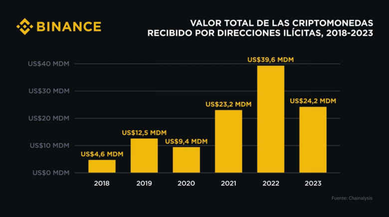Los delitos relacionados con el mundo cripto cayeron significativamente en 2023 a la luz de los esfuerzos de la industria por mejorar los controles, fortalecer la seguridad y ampliar la colaboración con las autoridades de cumplimiento de la ley, según muestran datos recientes. Los exchanges como Binance, proveedor de infraestructura para el ecosistema cripto líder en el mundo, continúan incrementando esfuerzos y recursos para combatir el intercambio ilícito y su uso de las plataformas.