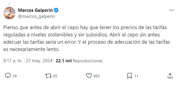 "Para abrir el cepo, en un país con la historia cambiaria de Argentina, es necesario tener un superávit fiscal sustentable. El subsidio a las tarifas dificulta mucho esto", sostuvo el ejecutivo, en su cuenta de la red social X.