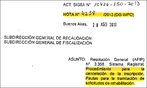 En efecto, a través de la nota 4238/2013 firmada por el director de la Dirección General Impositiva (DGI), Ángel Toninelli, el organismo a cargo de Ricardo Echegaray estableció "un conjunto de pautas de acción" para la tramitación de las solicitudes de rehabilitación presentadas por las empresas "cuya CUIT hubiera sido cancelada".
