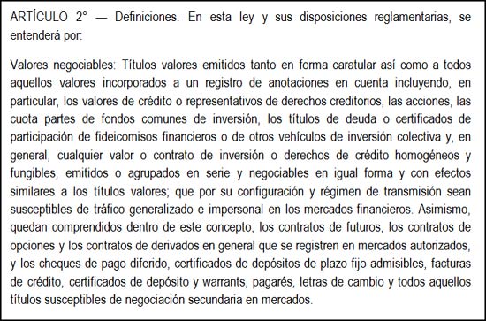 Y aclaró que el inciso a) del artículo 1 de la iniciativa tiene "relación con la definición de valores negociables establecida en la Ley 26.831 (de Mercado de Capitales)".