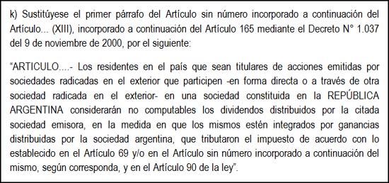 Dentro del primer grupo se encuentra lo establecido respecto de la distribución de dividendos o utilidades de empresas que residen en otros países y que participen de compañías que están en la Argentina.