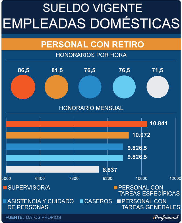 Los sueldos del servicio doméstico aumentaron 12% desde el mes pasado y el salario mí­nimo para la categorí­a "Personal para Tareas Generales" es de $71,50 la hora y $8.837 mensuales para el personal con retiro; y de $76,50 la hora y $9.826,50 por mes, sin retiro.