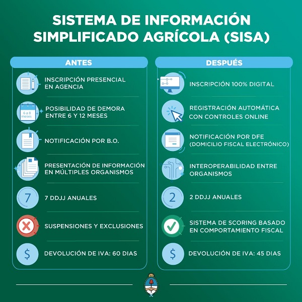 A través de la resolución conjunta 4248 publicada este jueves en el Boletín Oficial se pone en marcha el Sistema de Información Simplificado Agrícola (SISA), el registro que reemplazará a partir del 1 de noviembre próximo a cuatro registros: Registro Fiscal de Operaciones de Granos (RFOG); el Registro Fiscal de Tierras Rurales Explotadas (TIRE); el Renspa y el Padrón de Productores de Granos Monotributistas.