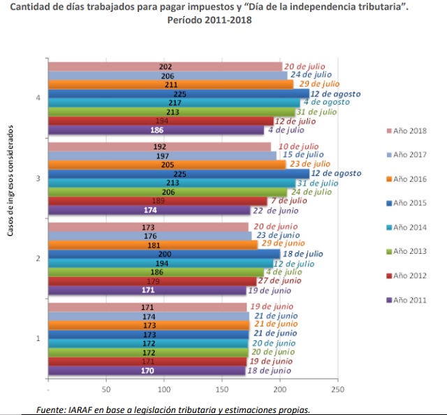 Este año, el Día de la Independencia Tributaria en Argentina para una familia asalariada comenzó el 19 de junio y puede llegar hasta el 20 de julio, según el nivel de ingreso del hogar, señala un nuevo informe del Instituto Argentino de Análisis Fiscal (IARAF)