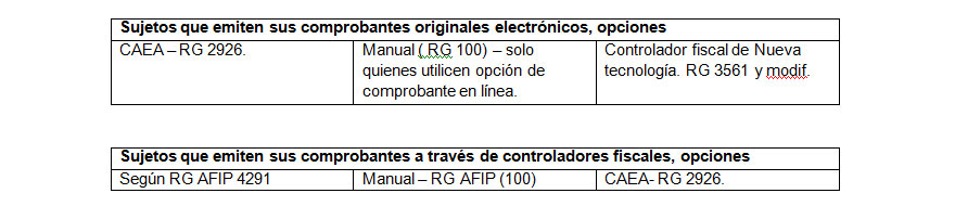Con el nuevo esquema de facturación introducidos por la Resolución General 4291, los contribuyentes deben optar para la emisión de comprobantes originales con las siguientes alternativas: