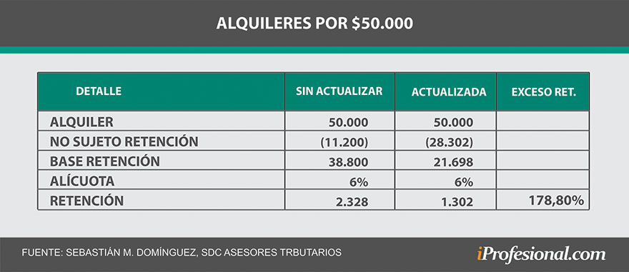 Una persona que alquila una oficina en $50.000 mensuales sufre una retención de $2.328 cuando la misma debería ser de $1.302 si se contemplara la inflación desde julio 2019 a diciembre 2021. Es decir, la retención es un 178,80% mayor a la que correspondería.