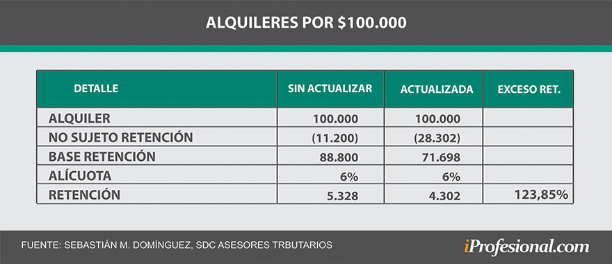 Una persona que alquila una oficina en $100.000 mensuales sufre una retención de $ 5.328, cuando la misma debería ser de $ 4.302 si se contemplara la inflación desde julio 2019 a diciembre 2021. Es decir, la retención es un 123,85% mayor a la que correspondería.