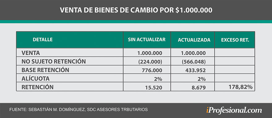 Una empresa vende bienes de cambio en $1 millón y sufre una retención de $15.520, cuando la misma debería ser de $8.679 si se contemplara la inflación desde julio 2019 a diciembre 2021. O sea que la retención es un 178,82% mayor a la que correspondería.