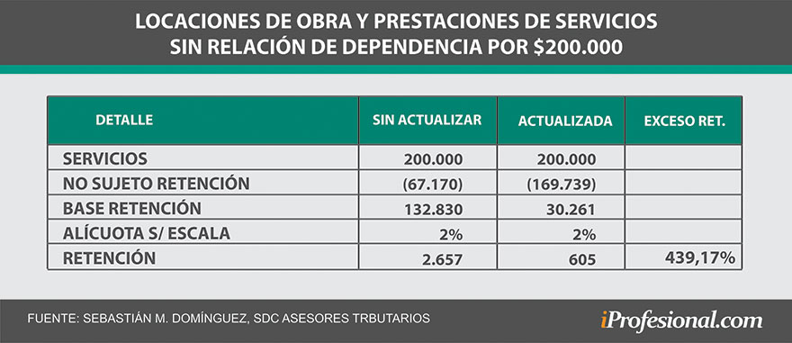 Una empresa que presta servicios por $200.000 sufre una retención de $2.657, cuando la misma debería ser de $605 si se contemplara la inflación desde julio 2019 a diciembre 2021. Es decir, la retención es un 439,17% mayor a la que correspondería.