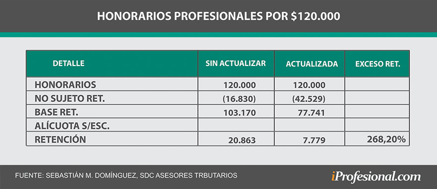 Un profesional que presta servicios por $120.000 sufre una retención de $20.863, cuando la misma debería ser de $7.779 si se contemplara la inflación desde julio 2019 a diciembre 2021. O sea que la retención es un 268,20% mayor a la que correspondería.