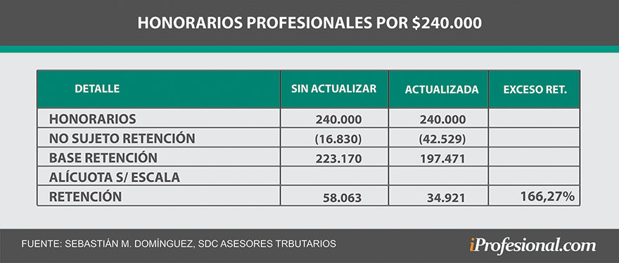 Un profesional que presta servicios por $240.000 y sufre una retención de $58.063 cuando la misma debería ser de $34.921 si se contemplara la inflación desde julio 2019 a diciembre 2021. Es decir, la retención es un 166,27% mayor a la que correspondería.