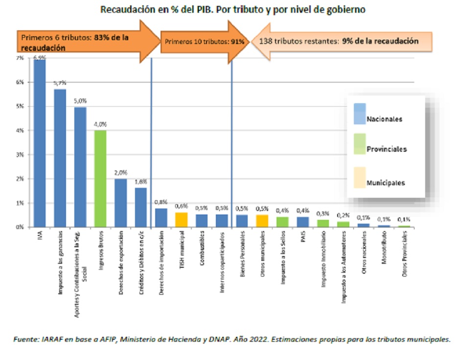Un reporte del Instituto Argentino de Análisis Fiscal (IARAF) plantea que en 2023 en Argentina hay 148 diferentes tipos de impuestos, nacionales, provinciales y municipales, cifra que representa una fuerte mejora respecto del 2022, año en el que hubo 165.