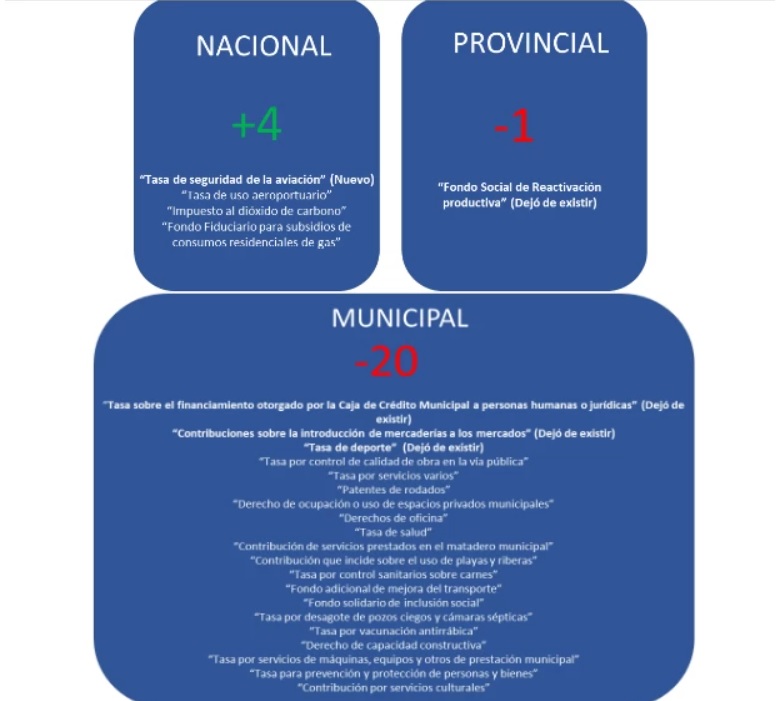 A nivel municipal se observó la eliminación de la "Tasa sobre el financiamiento otorgado por la Caja de Crédito Municipal a personas humanas o jurídicas", de las "Contribuciones sobre la introducción de mercaderías a los mercados" y de la "Tasa de deporte".
