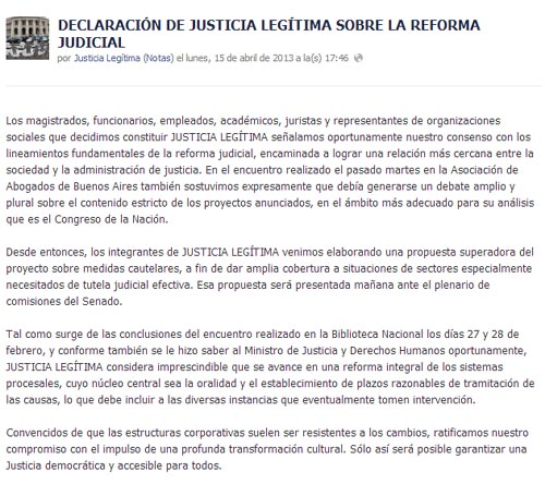 A través de un comunicado, "Justicia Legítima", liderado por la procuradora general Alejandra Gils Carbó, ratificó el "consenso con los lineamientos fundamentales de la reforma judicial, encaminada a lograr una relación más cercana entre la sociedad y la administración de justicia", tal como establecieron el martes pasado durante un encuentro en la Asociación de Abogados de Buenos Aires.