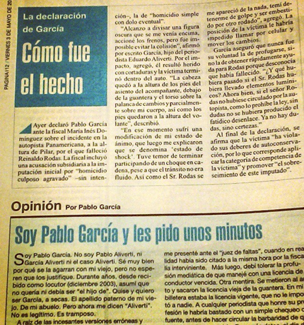Efectivamente, desde que sucediera el terrible accidente que cambiara mi vida y en el cual perdiera la vida el Señor Rodas, decidí guardar un absoluto silencio en su memoria y en respeto de sus familiares y seres queridos. Guardando silencio toleré todo tipo de mentiras y errores periodísticos, de los que sólo me cabe creer que tienden a generar presión tanto en la opinión pública como en quienes deberán decidir mi situación judicial. La imagen que públicamente se ha tratado de crear de mi persona, hasta el punto de producir que fuera víctima de "escraches" similares a los que se han realizado contra genocidas, represores y violadores sistemáticos de los derechos humanos, me resulta, por favor entiéndalo, mucho más injusta que comprensible. Si hubiera tenido que tolerarlo solo, quizás lo habría hecho. Pero mi nena y mi mujer (embarazada antes del accidente, por si se les ocurre mentir, también, que quiero dar lástima) ahora deben cuidarse de evitar lluvias de huevos o guardias periodísticas.