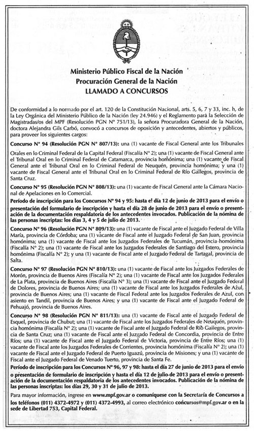 Luego de la denuncia por la presunta designación irregular de fiscales, la procuradora general de la Nación, Alejandra Gils Carbó, convocó a nuevos concursos públicos y abiertos de oposición y antecedentes para cubrir cargos vacantes.