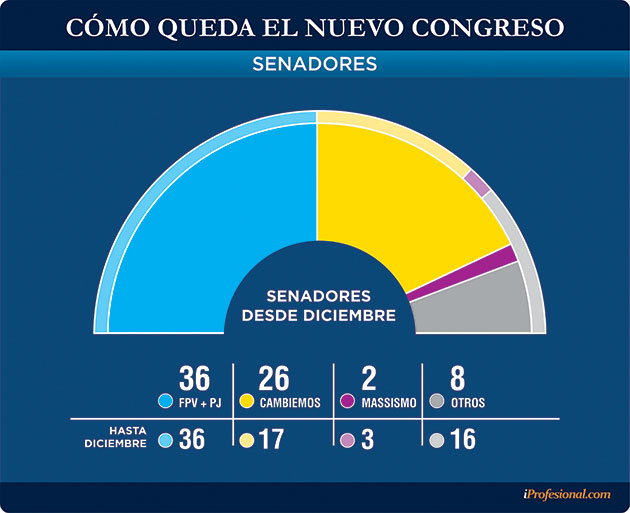 En el Senado, Cambiemos llegaba a 16 escaños de los 23 en juego. Unidad Ciudadana lograba 7, mientras que "1País" no alcanzaba los pisos de reparto en ninguna de las cuatro secciones donde se eligió ese cargo.