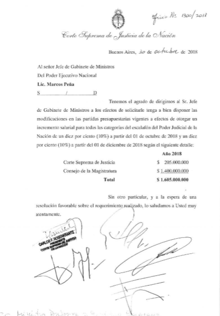 Según la misiva, firmada por el presidente del tribunal, Carlos Rosenkrantz, y por los ministros Elena Highton, Juan Carlos Maqueda, Horacio Rosatti y Ricardo Lorenzetti, con esas partidas se harían efectivos los incrementos pautados para el 1° de octubre (10%) y el 1° de diciembre (10%).