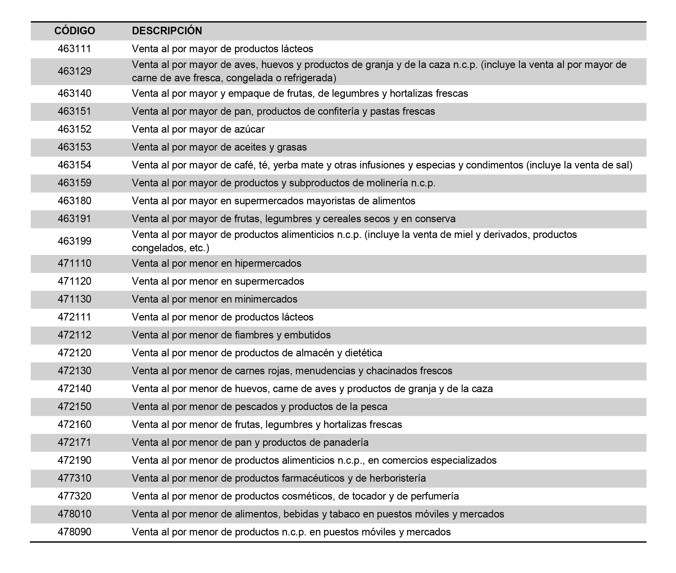 Los comercios mencionados deberán estar inscriptos ante la AFIP con los códigos de actividad que se detallan en el Anexo de la presente Resolución General. Las mismas son las siguientes: