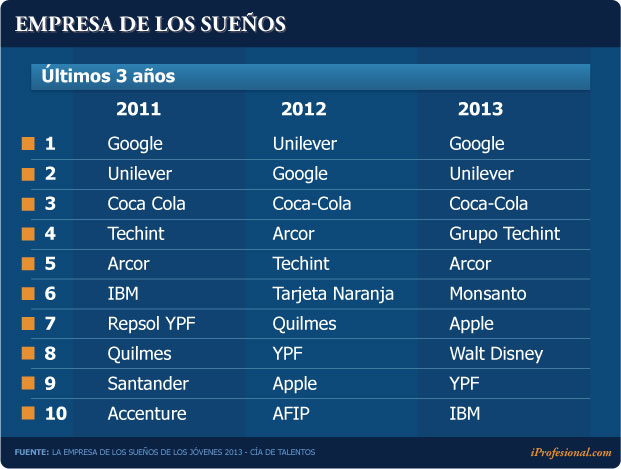 Y tal como muestra la siguiente infografía, Google, Unilever y Coca-Cola son las más elegidas entre quienes muestran interés en ingresar al mundo corporativo.