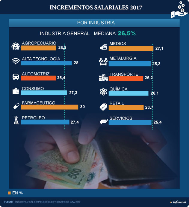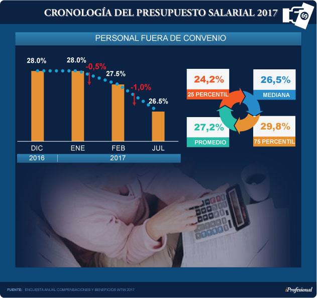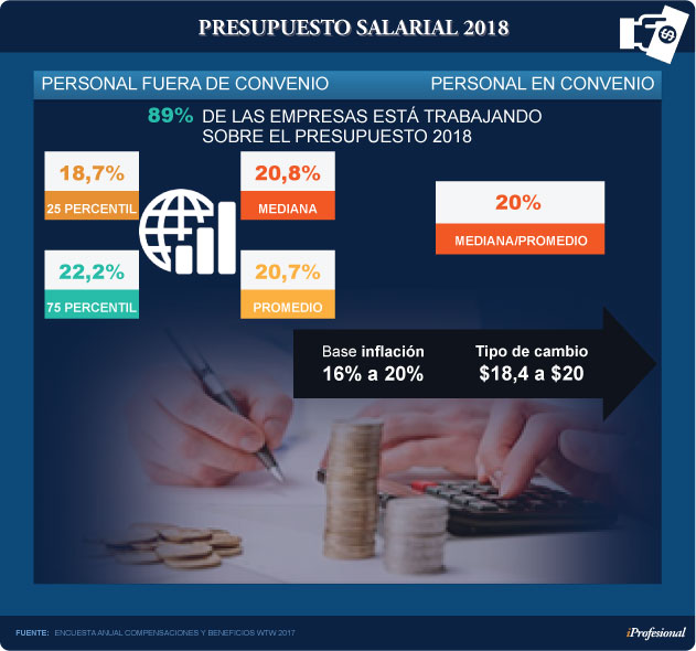 En 2017, en promedio, las compañías otorgaron un 27,2% de aumento dividido en dos tramos al personal fuera de convenio, porque estimaron una inflación del 24 por ciento. El acumulado del INDEC hasta el momento apunta un alza de 17,6 por ciento.