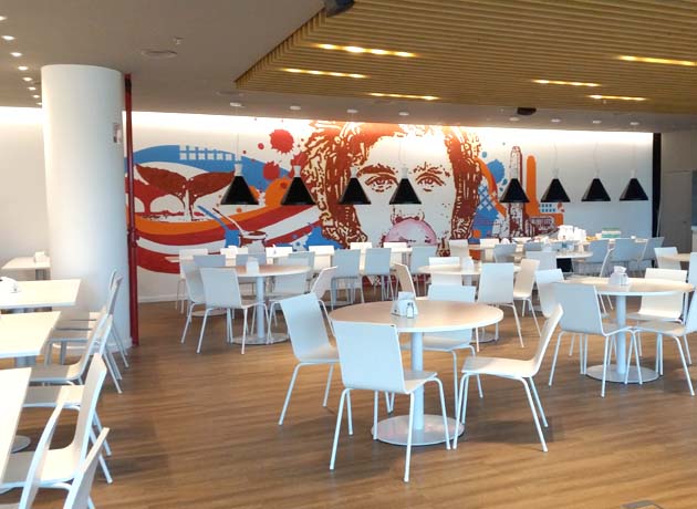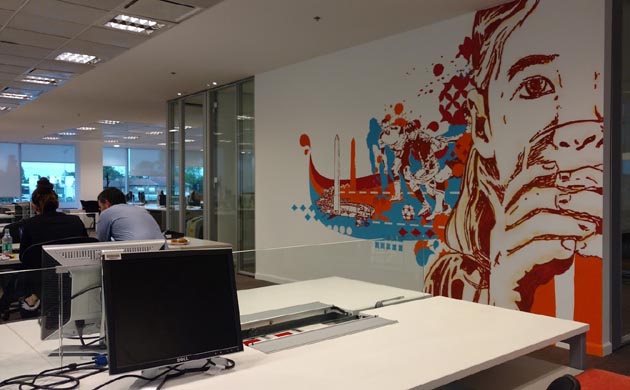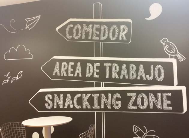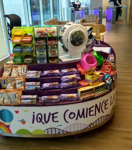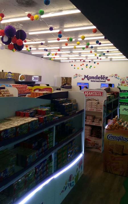 En esos espacios y los pasillos la compañía trabajó con el artista del grafitti Malatesta, quien diseñó cuatro murales inspirados en las categorías en las que opera la empresa -galletitas, jugos en polvo, chocolates, y chicles y caramelos- e intentó además darles una identificación local a partir de elementos distintivos como el Obelisco, el fútbol o el mate.