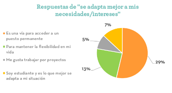 Considerando las respuestas de ese último grupo, el 29% lo contempla como un puente hacia un puesto de trabajo indefinido en el campo en el que se ha desarrollado.