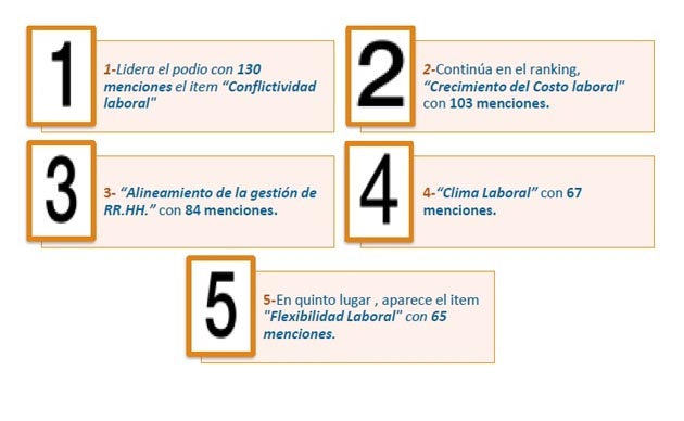 "‹En segundo lugar, el "Crecimiento del Costo Laboral", es una de las mayores preocupaciones en la agenda 2018, aunque en este punto hubo un decrecimiento del 13% en cuanto a las menciones (103) con respecto al último informe.