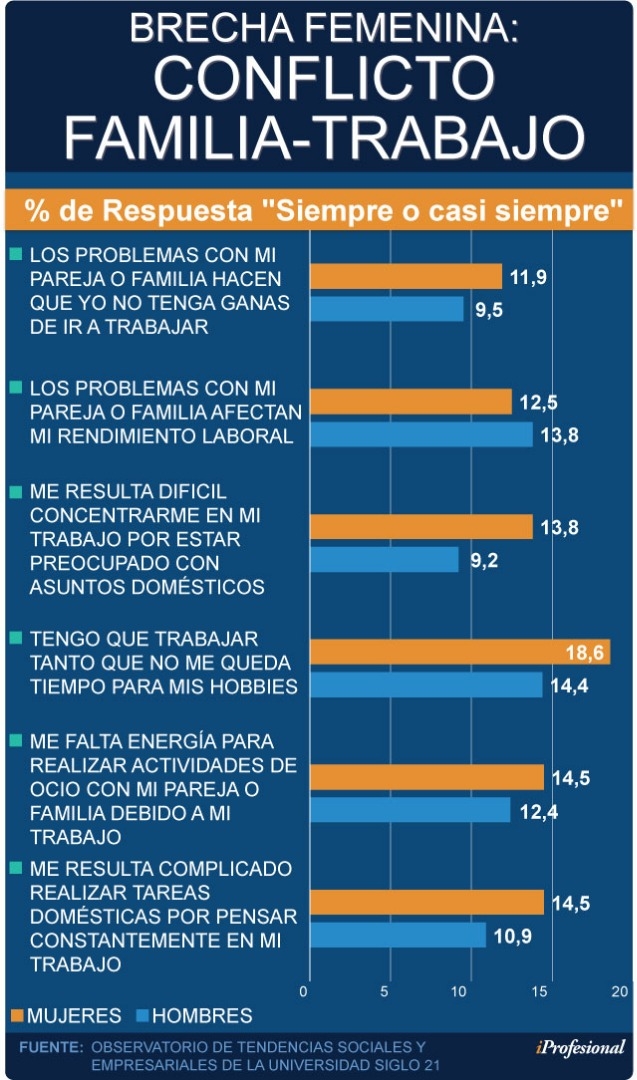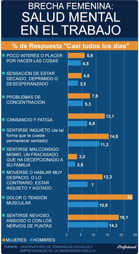 "Por esta razón, existe una brecha en cuanto a la calidad de vida", que en términos generales se traduce en que éstas afronten mayores conflictos en la relación familia-trabajo, niveles de estrés más altos que sus pares varones, más dificultad para relajarse y recuperarse luego de una jornada laboral, y en consecuencia, propensión a tener problemas emocionales como ansiedad, depresión y somatizaciones.