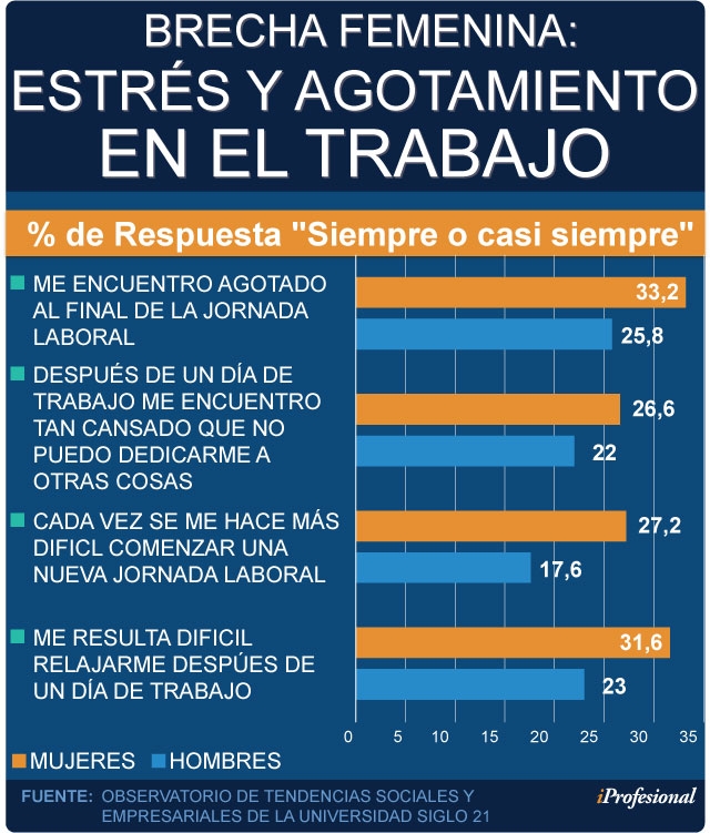 Por caso, el 33,2% señaló que "siempre o casi siempre" se encuentran agotadas después de la jornada laboral, mientras que esta cifra se reduce al 25,8% entre los hombres.