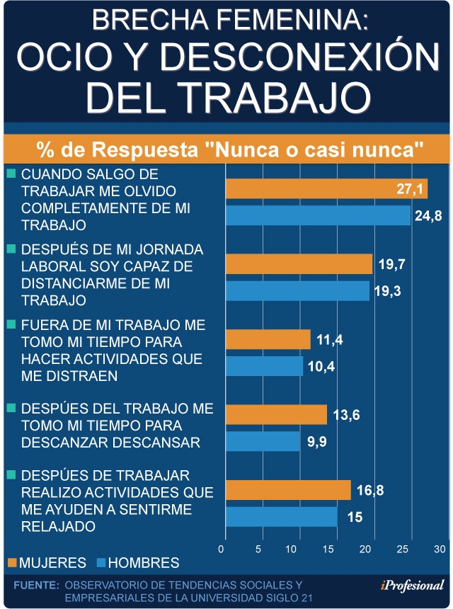 Segun Medrano, el agotamiento y el estrés no se resuelve simplemente teniendo más tiempo de ocio, sino que de lo que se trata es de lograr una verdedera desconexión de las exigencias -tanto familiares como laborales- durante ese período. En este punto es en donde las encuestadas demostraron tener mayor dificultad en relación a sus pares varones.