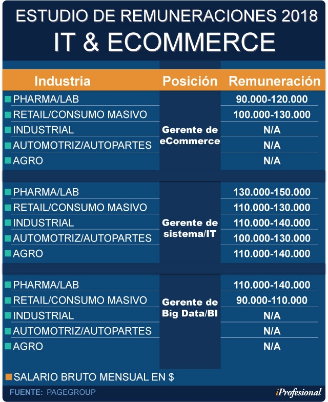 Claro que hay excepciones: un gerente de ecommerce percibe un mejor salario en retail, pero un responsable de Big Data tiene una remuneración mayor en el sector de laboratorios que en los demás, de acuerdo a los datos disponibles.