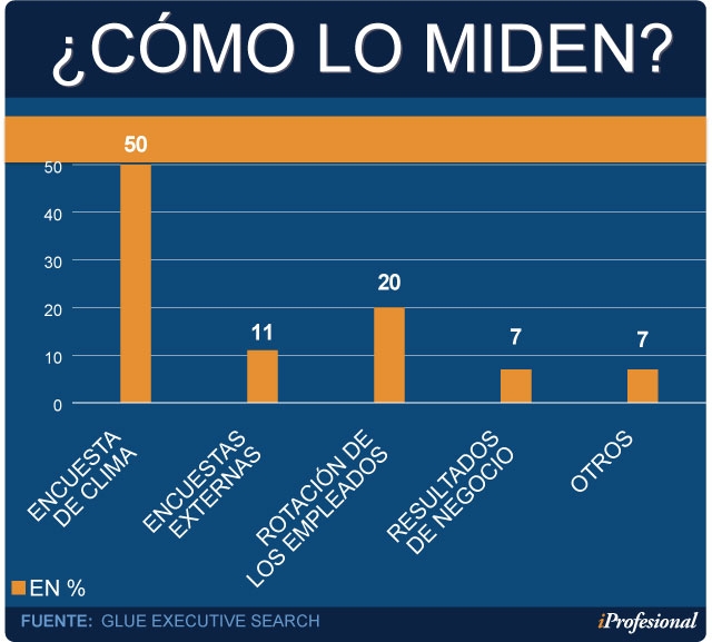Entre las que desarrollan algún tipo de evaluación, el 50% releva el impacto a través de una encuesta de clima interno, otro 20% analizando el nivel de rotación; 11% por medio de encuestas externas y sólo el 7% por los resultados de negocio.