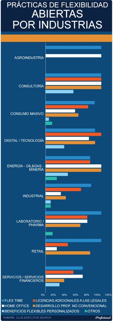 La ejecutiva de Glue optó por no minimizar el avance que esta polí­tica ya demuestra en el mercado local: "Lo que vemos es que más de la mitad de todas las compañí­as tienen 'flex time'. Y eso no es menor. Más de la mitad dan este tipo de beneficios y el desafí­o que queda es hacerlos personalizados".