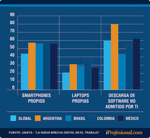 Una investigación de la División del lugar de trabajo digital de Unisys a la que accedió iProfesional muestra que el 58% está utilizando sus propios teléfonos inteligentes, frente al 45% que hace lo mismo a nivel global.