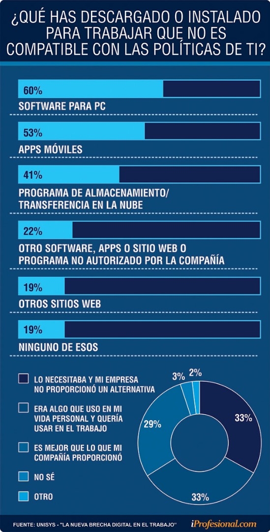El 32% usa sus propias computadoras portátiles, frente al 22% en el mundo, y el 81% descarga software no admitido por el equipo de IT de su compañía.