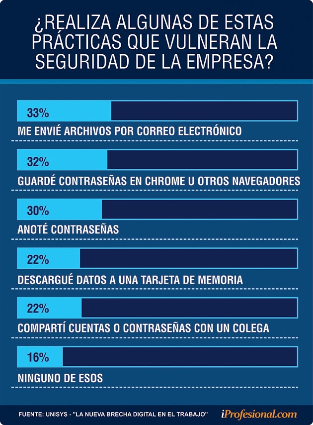 Por ejemplo, el 84% de los trabajadores argentinos cometieron violaciones de seguridad, como compartir cuentas o contraseñas con colegas (es el 71% a nivel mundial). "Esto quiere decir que dos tercios de las personas con las que hablamos comparten su password. Con la burocracia, pedir una información lleva mucho tiempo, por eso se comparten los accesos, y no es una costumbre exclusiva de la región latinoamericana", destacó Almeida.