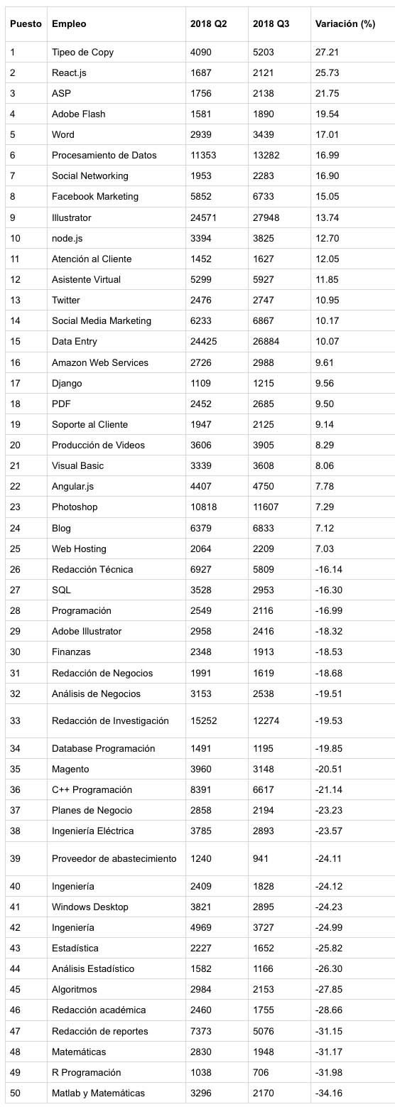 En esta última edición, reveló que desarrollo web -ASP y React.js-, social media -con Facebook Marketing a la cabeza-, y aquellos trabajos que demanden conocimientos de creatividad digital (Illustrator y Photoshop) pegaron un salto importante respecto al último periodo, y se mantienen en los primeros 10 lugares del ranking.