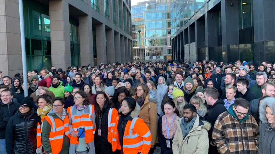 En Londres, una treintena de empleados se manifestaron delante de la sede de la compañía en Reino Unido, la mayoría del resto de trabajadores también participaron en el paro simbólico desde dentro de las oficinas.