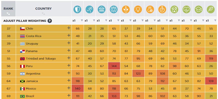 Por otra parte, los de Latinoamérica quedaron, sobre todo, en el grupo de países con prosperidad media. El mejor calificado este año fue Chile, que quedó en el escalón 37, seguido inmediatamente por Costa Rica en el 38 y Uruguay en el 39.