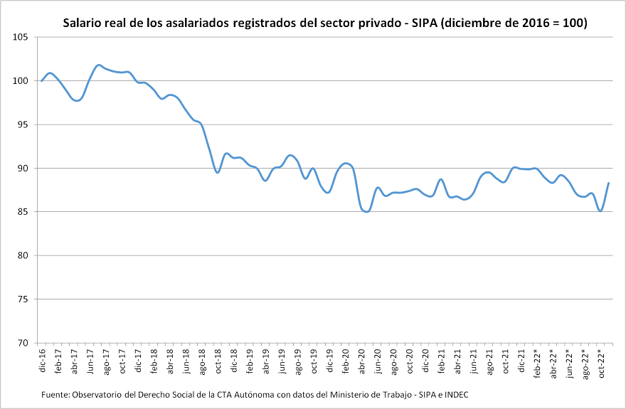 Ahora bien, esos números no dan cuenta de toda la situación. Luis Campos, economista del Observatorio de Derecho Social de la CTA, indicó que pese a que el salario promedio tuvo una suba del 8,9% en noviembre de acuerdo al SIPA y recortó así su caída en términos reales, la mediana salarial que mide el ministerio muestra que "los ingresos de la mitad de los asalariados registrados del sector privado fueron inferiores a $129.288 de bolsillo por mes."
