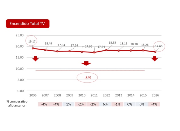 El tiempo de exposición a la televisión igualmente viene bajando considerablemente. Según Ignis, en los últimos 10 años se redujeron las horas que se pasan frente a un televisor y el encendido se redujo en un 8%.