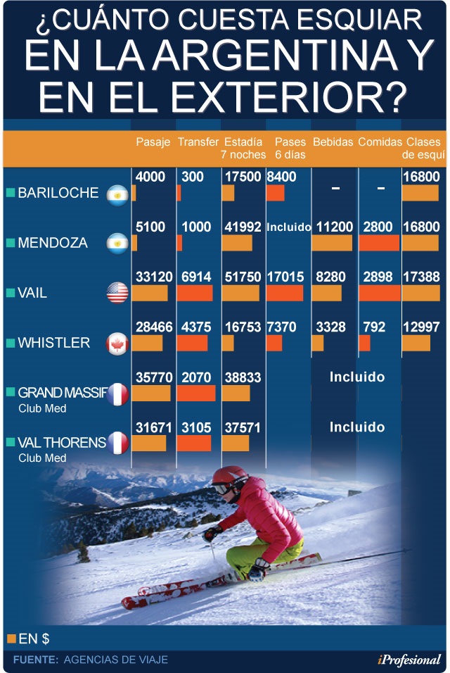 Teniendo en cuenta los importes, viajar una semana a los mejores resorts de nieve de la Argentina, Canadá o Francia demandará presupuestos similares: entre u$s3.500 y u$s3.800.