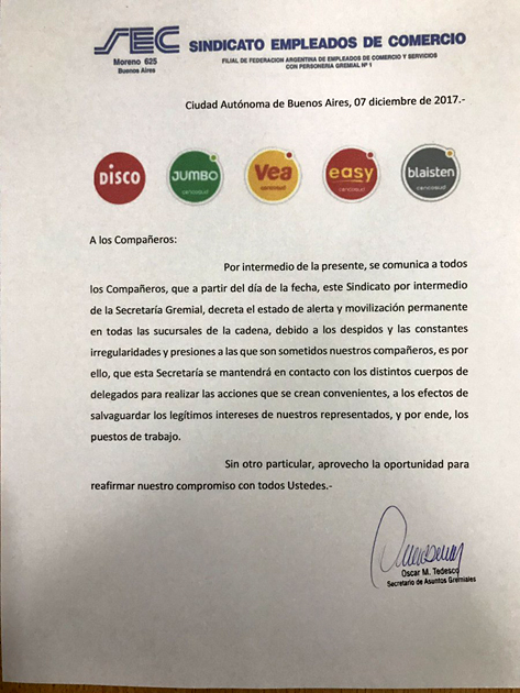 "Cuando hemos pedido negociar las condiciones de trabajo, Cencosud siempre respondió de la misma forma: despidiendo compañeros. Ahora se dio una situación de tensión enorme en la sucursal de Disco en avenida Rivadavia. Echaron a mujeres que son sostenes de familia. Semejantes atropellos nos obligan a impulsar paros hasta que la empresa deponga su actitud", enfatizó.