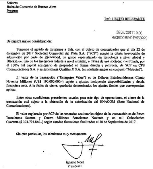 En un comunicado remitido este martes a la Bolsa porteña, Comercial del Plata detalló que los compradores son RiverWood, un fondo de inversión con foco en el segmento tecnológico, y su par estadounidense Blackstone, un gigante que nació como estandarte del capital de riesgo en 1985 y hoy acumula activos en todo el mundo por alrededor de u$s370.000 millones.